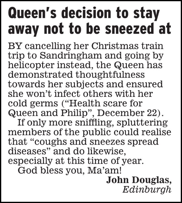 Elsewhere, and a considerate old lady has set an example by not mixing with the crowds when she’s not very well, thus spreading her filthy germs all over the place..