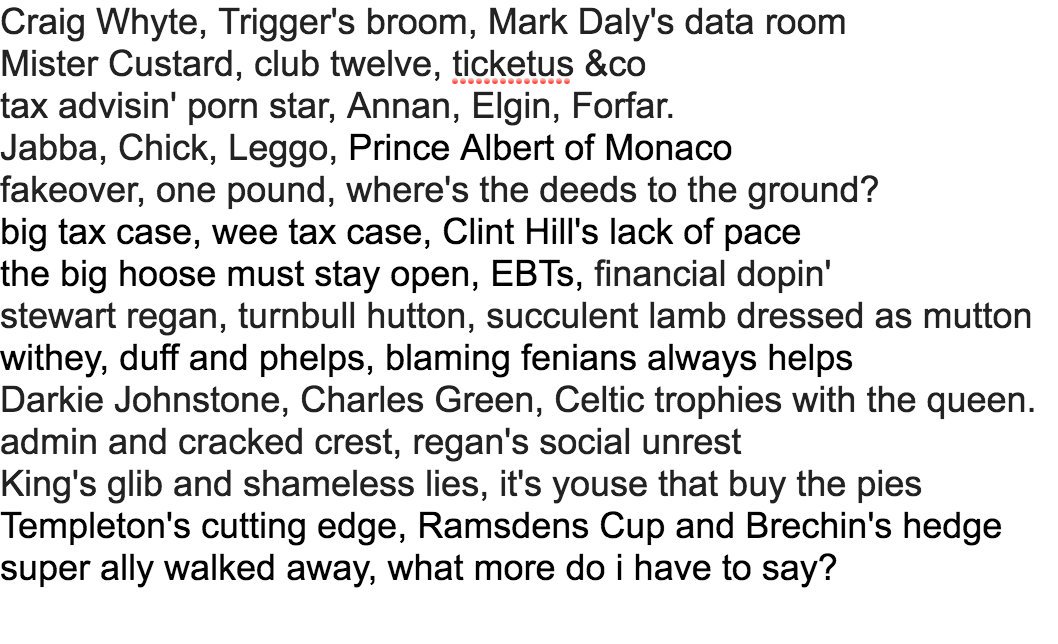 All of which isn’t pleasant to ponder, but as we have seen, a “strong Rangers 2 is apparently essential to the game, and therefore when all of this is over, keep an eye out for a major reform in the game. Not quite making EBTs legal, but some other rule-possibly a draft of promising young players-designed to even out the spread of talent emerging, and all with the aim of stopping Celtic reaching that magical ten in a row.