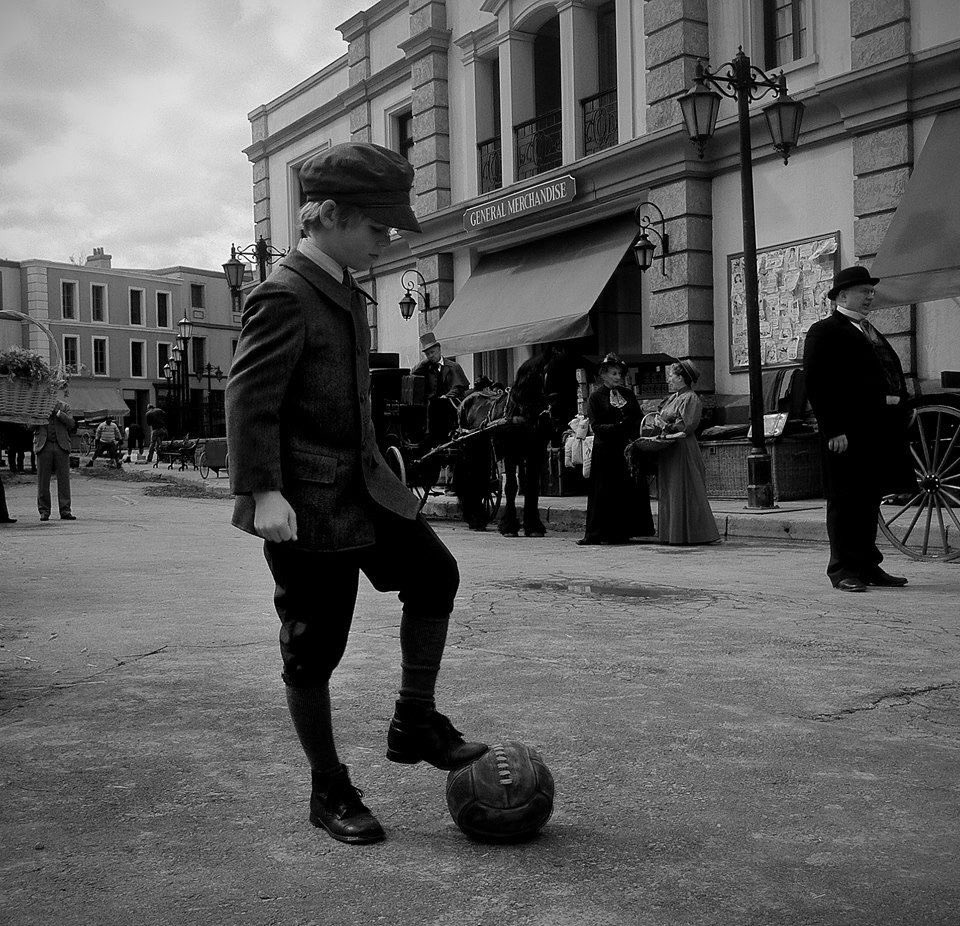 Giant child plays football in the streets.