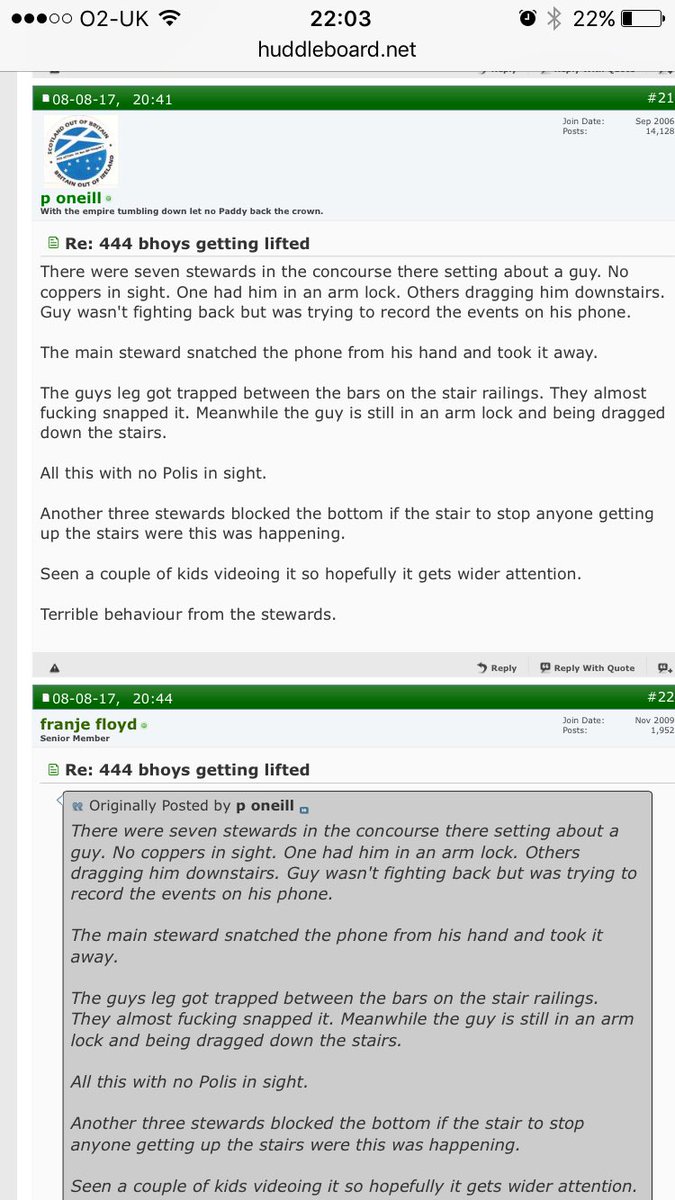 Of course, one has to be objective when looking at reports of incidents like the one above, but there are camera’s within the ground, and i’m quite sure that the footage is being examined, and any action against stewards that needs to be taken will be taken.