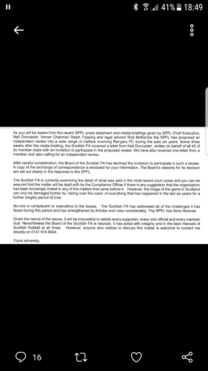 Celtic are the other club who wrote independently to the SFA (about 8 weeks ago?) That is mentioned in SFA response.