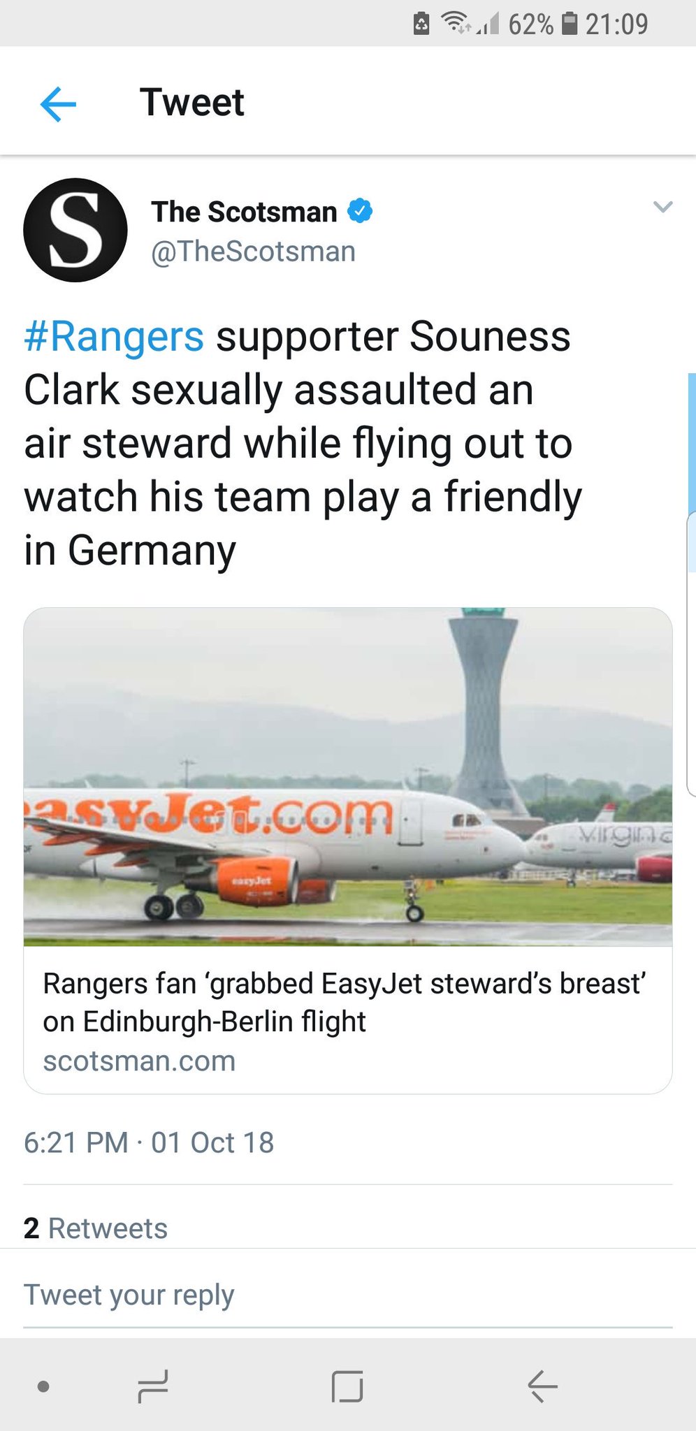 There’s a story about a “rangers ” fan sexually assaulting an air stewardess…