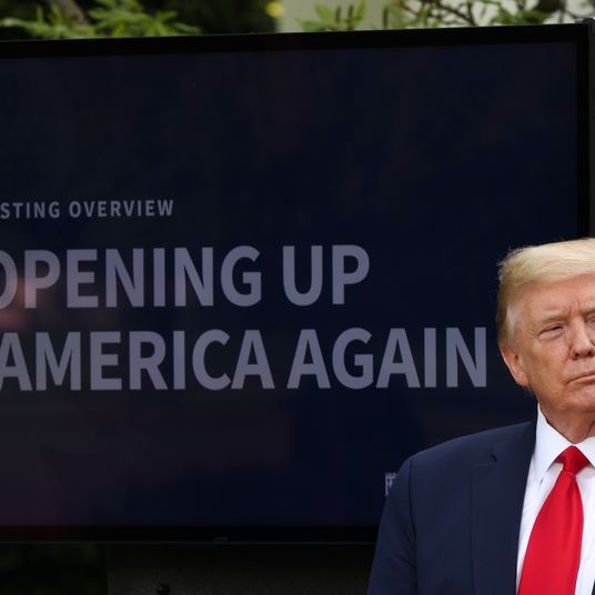 In the two weeks since, we’ve gotten some clarifying information on at least a handful of Warzel’s queries. In early trials, more patients taking the Trump-hyped hydroxychloroquine died than those who didn’t, and the FDA has now issued a statement warning coronavirus patients and their doctors from using the drug. The World Health Organization got so worried about the much-touted antiviral remdesivir, which received a jolt of publicity (and stock appreciation) a few weeks ago on rumors of positive results, the organization leaked an unpublished, preliminary survey showing no benefit to COVID-19 patients. Globally, studies have consistently found exposure levels to the virus in most populations in the low single digits — meaning dozens of times more people have gotten the coronavirus than have been diagnosed with it, though still just a tiny fraction of the number needed to achieve herd immunity. In particular hot spots, the exposure has been significantly more widespread — one survey in New York City found that 21 percent of residents may have COVID-19 antibodies already, making the city not just the deadliest community in the deadliest country in a world during the deadliest pandemic since AIDS, but also the most infected (and, by corollary, the farthest along to herd immunity). A study in Chelsea, Massachusetts, found an even higher and therefore more encouraging figure: 32 percent of those tested were found to have antibodies, which would mean, at least in that area, the disease was only a fraction as severe as it might’ve seemed at first glance, and that the community as a whole could be as much as halfway along to herd immunity. In most of the rest of the country, the picture of exposure we now have is much more dire, with much more infection almost inevitably to come.